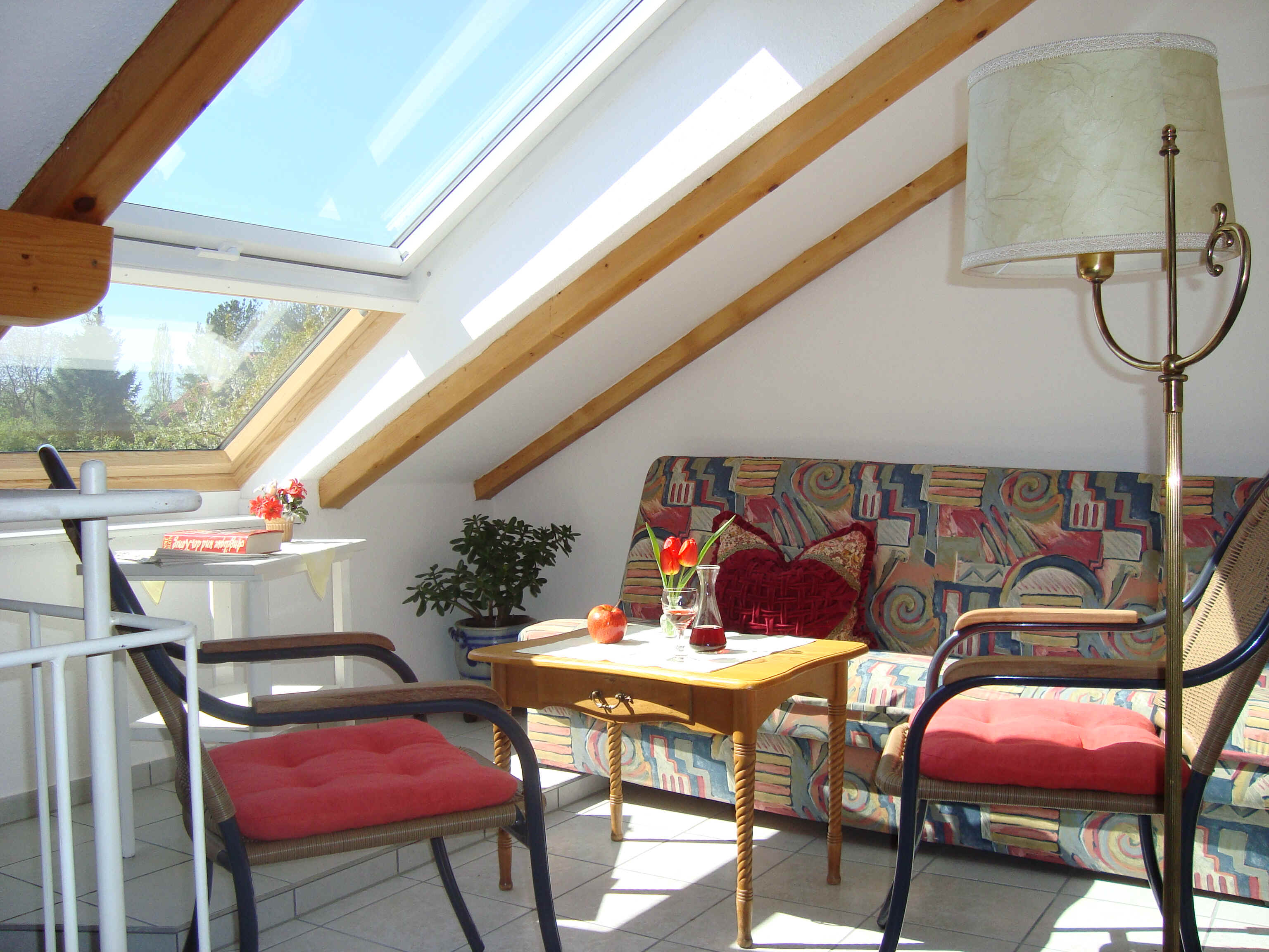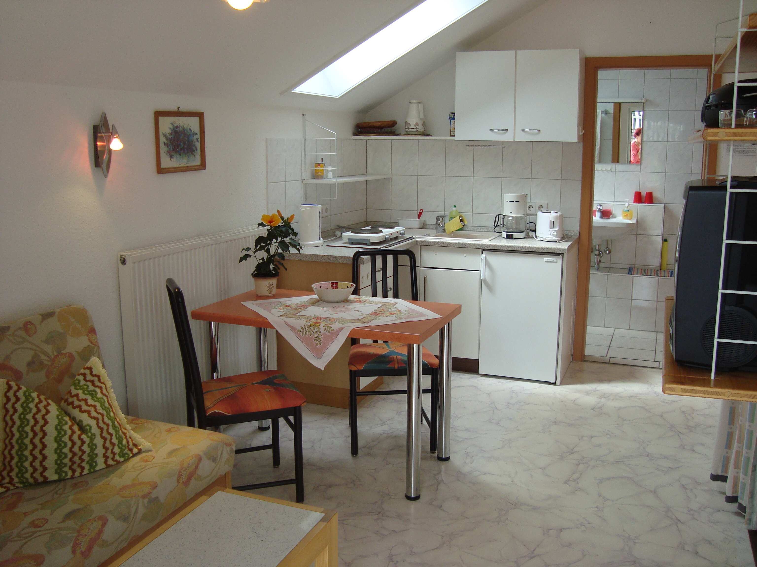1 Eß-Wohnzimmer mit Küchenzeile, Kaffeemaschine, Toaster, Wasserkocher, Spüle, Geschirr usw., Kühlschrank. Sat-TV, Radio, Dachfensterbalkon-Nische