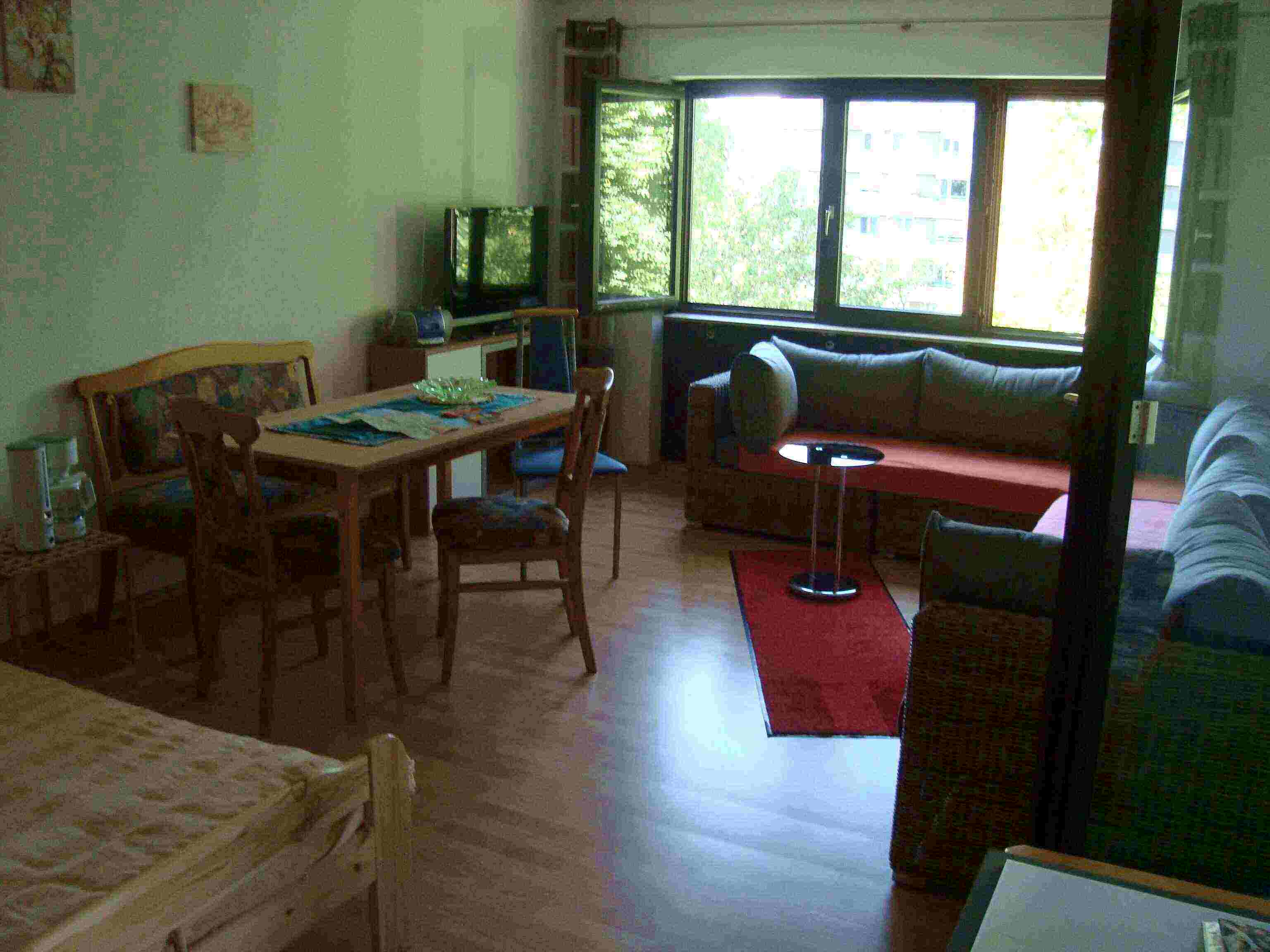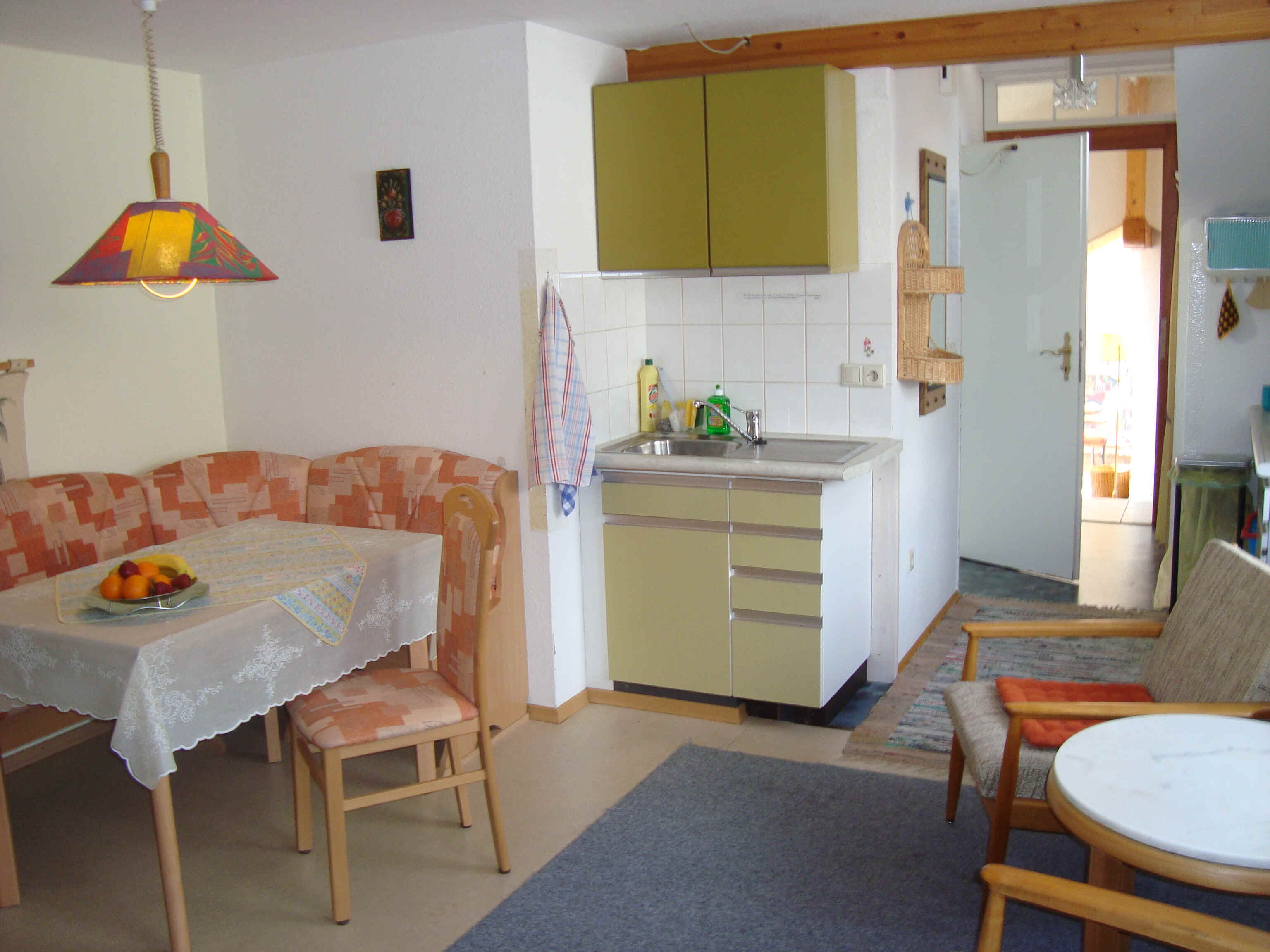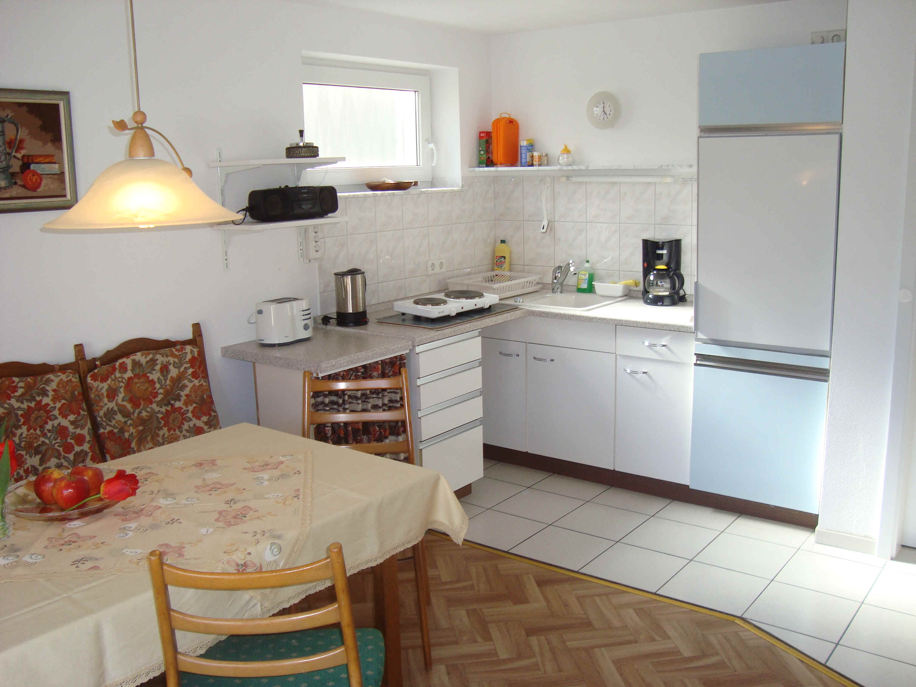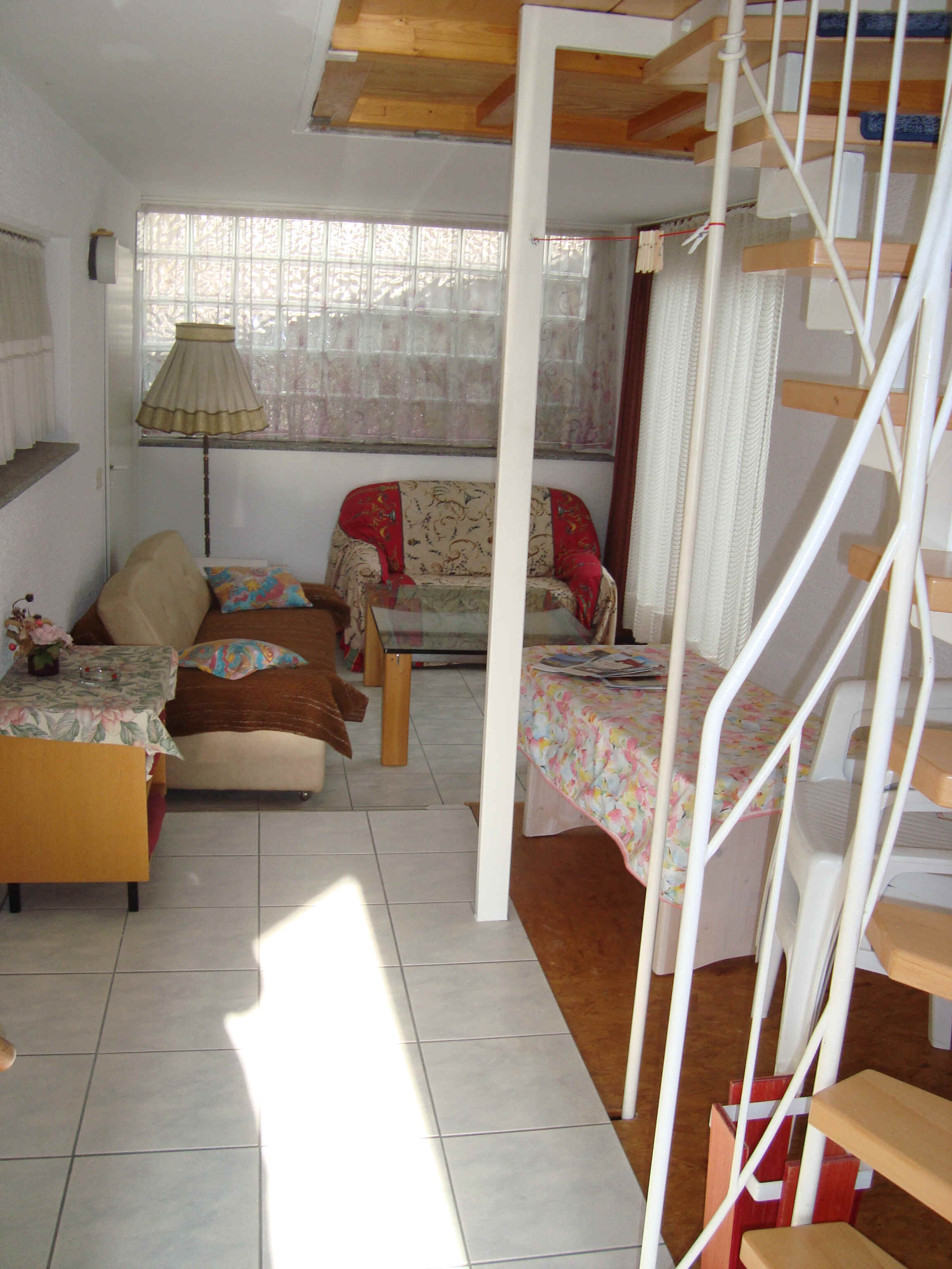1 Wohn-Eßzimmer mit integr.Küchenzeile, Kaffeemaschine, Toaster, Wasserkocher, Spüle, Geschirr usw., Kühlschrank. Radio, Sat-TV, 1 weiteres WC