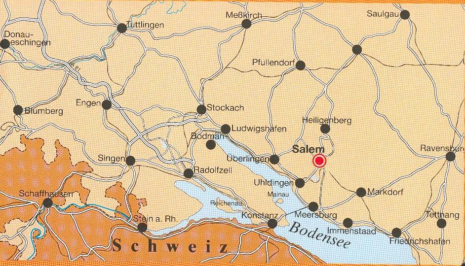 Salem liegt etwa in der Mitte des deutschen Bodenseeufers - Nähe Meersburg, ca. 7 km vom Bodensee entfernt. Die Feriengäste schätzen vor allem die zentrale Lage für Tagesausflüge und die sehr gut ausgebauten Fahrrad- und Wanderwege und außerdem die guten Bahn-und Bus-Verbindungen und den kostenlosen Parkplatz im Grünstück.
